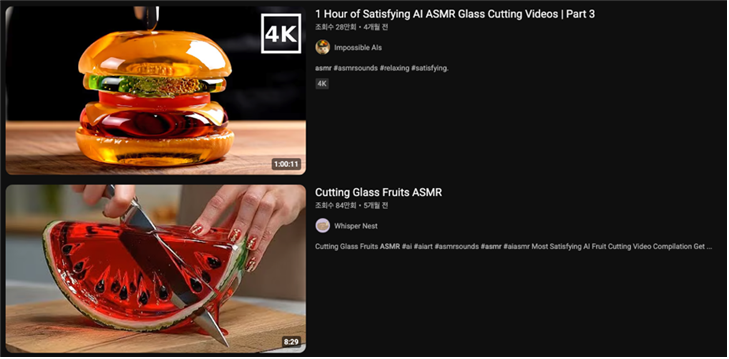 유튜브를 포함해 전세계 SNS 알고리즘을 가장 빠르게 장악한 AI 영상 테마 중에는 ‘유리 자르기 ASMR’이 있다. 각종 음식이나 물건들을 유리 재질로 변환하고 스테인리스 칼로 서걱서걱 잘라내는 영상들이 유행을 일으키는 와중, AI가 프롬프트를 구현하면서 엉뚱한 모션이 발생한 실패작 모음 영상까지 동반 인기에 올랐다.