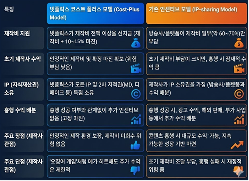 넷플릭스와 한국 제작사 간의 거래 모델인 ‘코스트 플러스(Cost Plus)’ 방식은 넷플릭스 종속의 핵심적인 문제점이다. 이 모델은 넷플릭스가 제작비 전액(100%)과 약 10~15%의 보장 마진을 제작사에 지급하는 대신, 콘텐츠에 대한 모든 지식재산권(IP)과 글로벌 유통권을 넷플릭스가 독점하는 구조다.