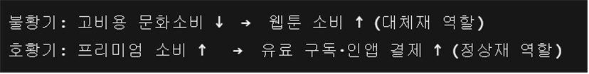 반대로 경제 호황기에는 독자들의 프리미엄 소비 성향이 강화되며, 정액 구독 모델이나 고부가가치 웹툰 소비가 늘어난다. 이는 웹툰이 단순한 대체재를 넘어, 소득 증가에 따라 수요가 늘어나는 정상재(normal goods)로 기능할 수 있음을 의미한다.
